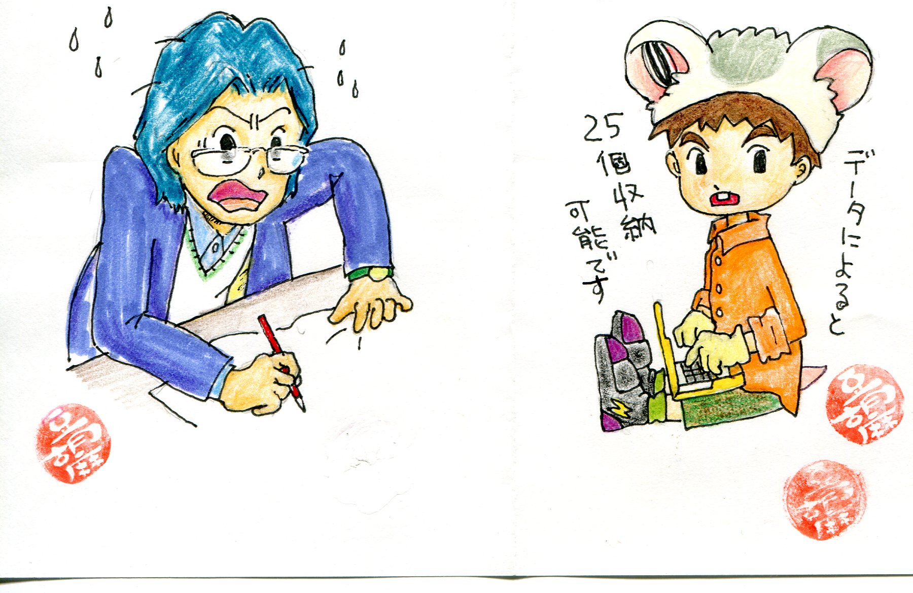 丈先輩は、02でも、ウォーゲームの時のような目に会うかも。でも、仲間の一員としてそういう形で敵と戦っているんです。 「(ほっぺにエサが)♪25個入るよハム太郎♪」は確かハム太郎のEDの歌詞ですね。ちなみに、白地にぶちは「こうしくん」です(笑 何でこの2作を同じ紙に描いたのか、覚えていません。 もどる