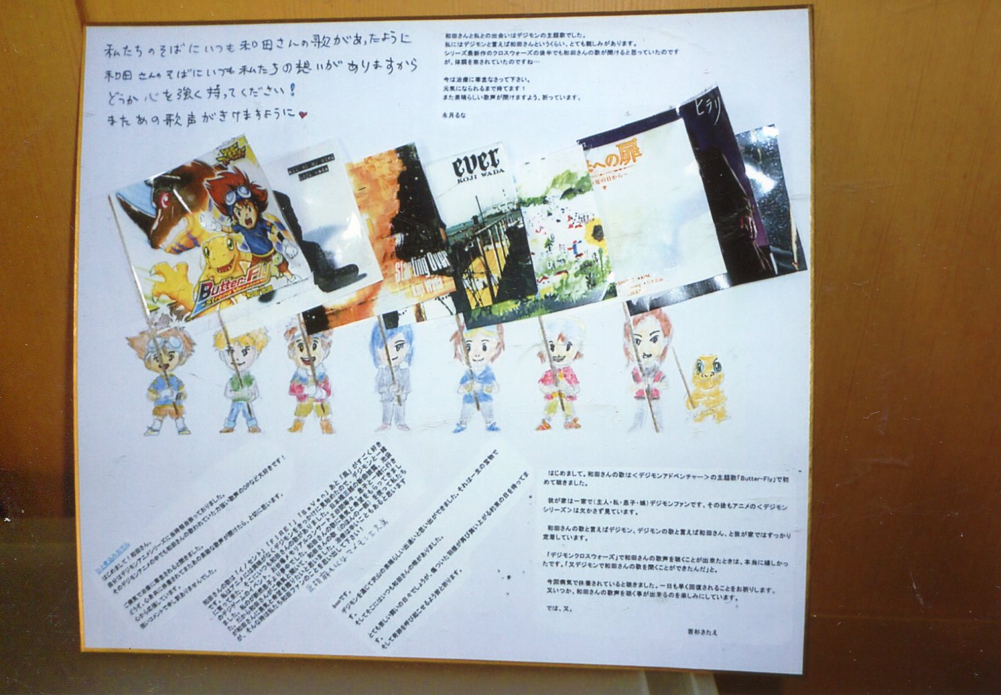 和田光司さんがご病気と聞いて、デジ友さんに呼びかけメッセージを集め、色紙に貼って送りました。各シリーズの主人公たちが旗を持って和田さんを応援しています。旗は、和田さんのCDジャケットをプリントして作りました。 もどる