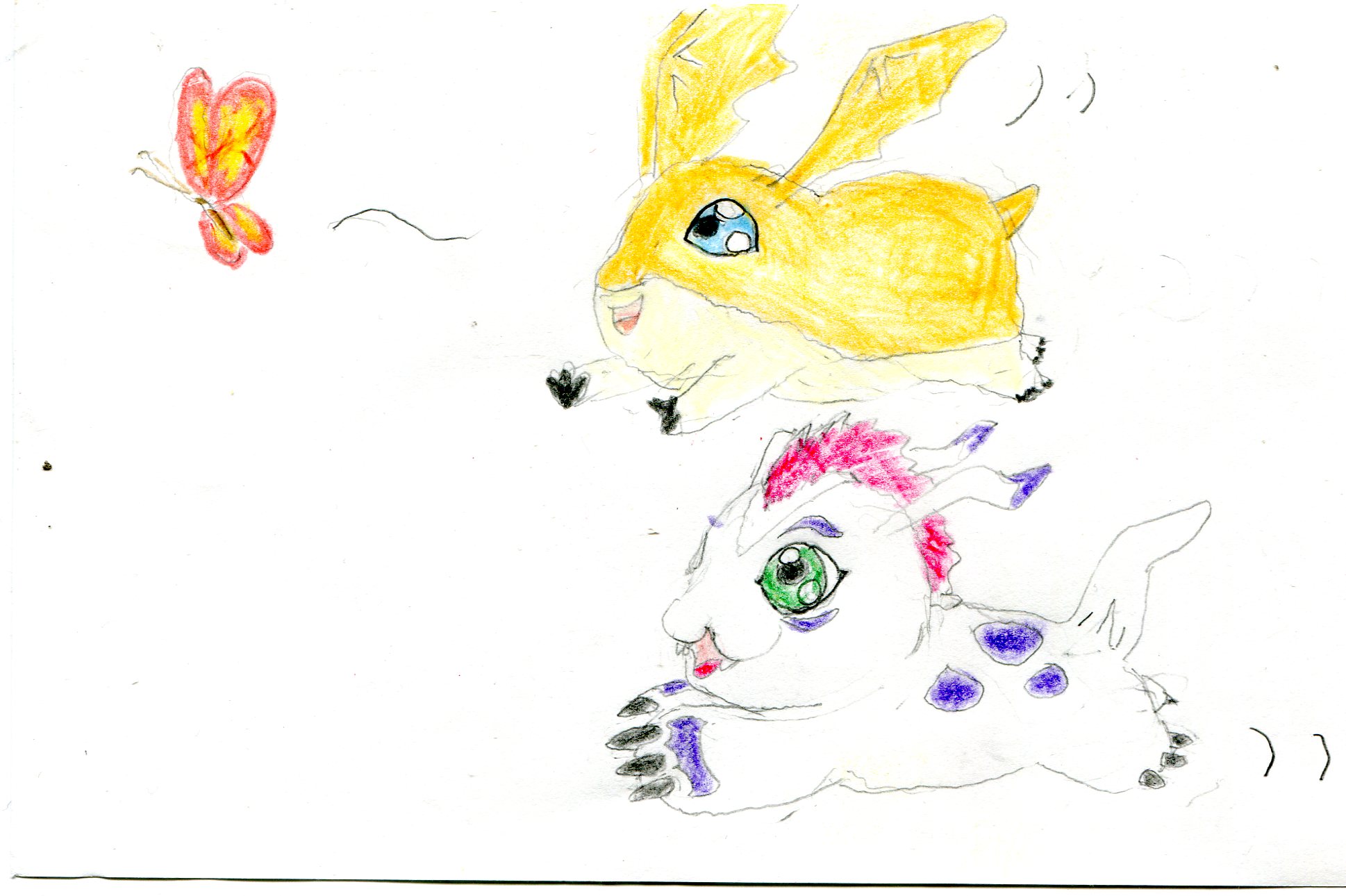 掲示板の2000番キリ番リクエストは、パタモン好きさんの「パタモンとゴマモン」でした。パタモンの見た目とゴマモンの内面がとても好きだというパタモン好きさん。どちらもかわいいですよね。 歩くのが苦手なゴマモンと、飛ぶのが遅いパタモンを描いてみました。デジモンを描くのは久しぶりで、画材はHBのシャーペンと色鉛筆です。キリリクありがとうございました。 もどる